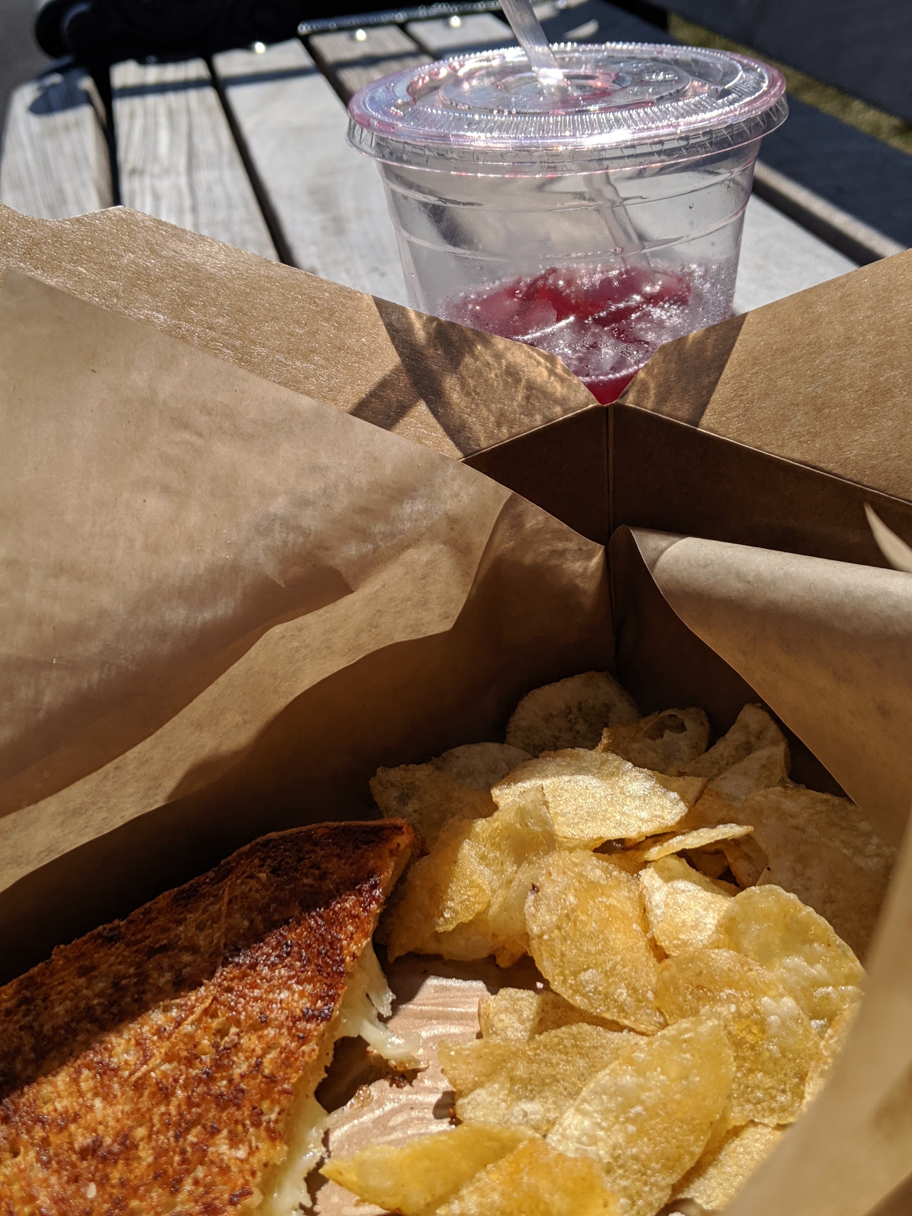 The porch has a couple coveted tables for outdoor snacking that we were eyeballing as it was a near perfect 75-degree (Fahrenheit) day. The porch tables were still full after our food came out, so we walked to the waterfront, only 10 minutes away.